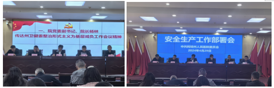 2024年4月29日下午阿坝州人民医院党委组织召开2024年党建暨党风廉政建设工作会议、党纪学习教育工作推进会、整治形式主义为基层减负工作部署会、安全生产工作部署会,院党委书记潘华主持会议。