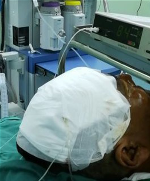 患者自发病以来,一直呈昏迷状,病情危急危重。6月25日再次给以患者行急诊颅脑CT扫发现颅内异常(颅内出血、脑挫裂伤、脑水肿、脑肿胀或缺血、基底池不清晰等)的急性重型颅脑创伤患者(GCS 5分)。患者伴有颅骨骨折,脑积液耳瘘及鼻瘘,到底是脑肿胀还是缺血,在临床医生评估不能确定。脑肿胀建议去骨瓣减压术,首先去右侧额颞部,去了骨瓣后有没有人为造成脑疝死亡加重,还是双侧骨瓣都去,指南告知双侧额颞顶部骨瓣去除,不死即重残,后期并发症较多,黎明主任立即组织全科讨论后建议此类重症病例实施国内外提倡的颅内压监测,根据监测结果是否手术,并立即上报医务科,按照国家规定立即落实一次性耗材申请机制,采购颅内压监测器械。