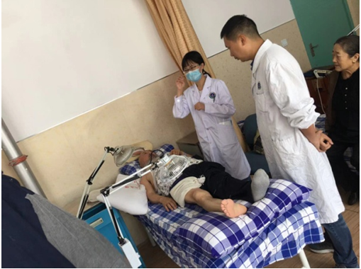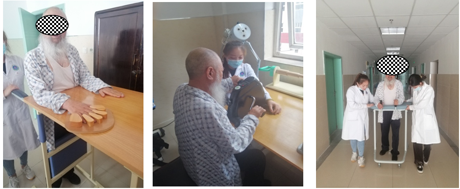 7月16日上午,一位68岁的老年男性患者,因“脑梗塞后右侧肢体功能障碍伴言语不清3+月”在阿坝州人民医院康复科门诊就诊,患者病情复杂,接诊医师立即上报科室副主任林洪,林主任立即组织集体会诊,邀请刚好在州人民医院下派的四川省人民医院康复科付婧主治医师与科室白员印副主任医师、马雪瑶医师共同为患者作检查,初步诊断为脑梗塞恢复期。与患者及家属充分沟通后决定收治入院进行规范化康复治疗。入院后由医师、治疗师、护理团队根据共同完成康复评定,患者存在的功能障碍有:右侧肢体功能障碍,言语功能障碍,吞咽功能障碍,右肩关节脱位,右侧肌张力升高,步态异常等功能障碍。并根据现代康复理论制定了康复目标及康复方案,用以现代康复治疗技术如bobath技术、Brunnstrom技术、rood技术、站立训练、转移功能训练、步态训练、呼吸功能训练、日常生活能力训练、心理干预治疗同时结合科室传统中医针灸治疗的综合性康复治疗促进患者偏瘫肢体功能的恢复。在治疗中同时向患者及家属宣教关于肩托、支具、口肌训练器、辅助器具及家具环境改造等方面的康复知识。经过近两周的规范治疗后,患者的右侧肢体功能较前有明显的进步,能在辅具下完成穿衣、吃饭等日常活动,能在医院及社区行走,上下楼梯。患者已达到近期康复治疗目标,患者本人和家属对本次康复住院治疗的疗效予以充分肯定。
