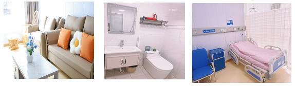 家庭化布置:独立单间,配备可调节病床、沙发床、独立卫浴、电视、冰箱等生活设施。