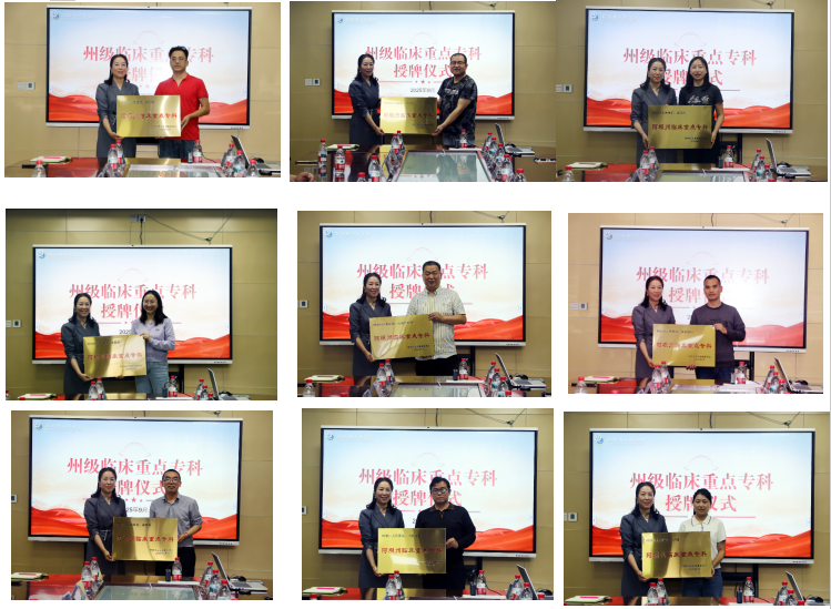 最后,口腔科、超声科、皮肤科、心血管内科、耳鼻喉科、麻醉科、护理、内分泌科、药剂科等9个获评州级重点专科专科负责人上台接牌,并合影留念。