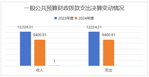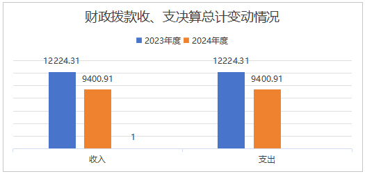 2024年度财政拨款收入、支出总计均为9400.91万元。与2023年度相比,财政拨款收入总计、支出总计各增减少2823.4万元,下降23.1%。主要变动原因是2024年度无疫情相关财政收入及支出。