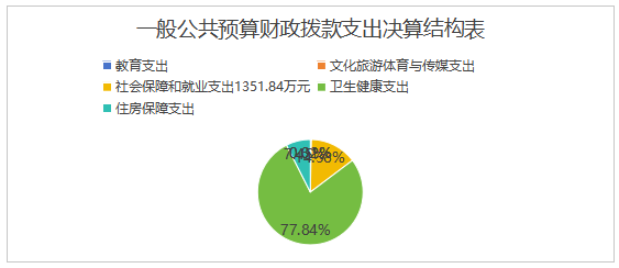 2024年度一般公共预算财政拨款支出9400.91万元,主要用于以下方面:一般公共服务支出0万元,占0%;教育支出30万元,占0.32%;科学技术支出0万元,占0%;文化旅游体育与传媒支出0.5万元,占0.01%;社会保障和就业支出1351.84万元,占14.38%;卫生健康支出7317.79万元,占77.84%;住房保障支出700.78万元,占7.45%;