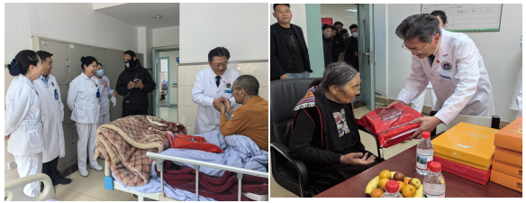 座谈会后,院领导与医护人员前往病房对卧床患者开展床旁慰问,潘华书记亲手将保暖衣送到患者手中,与老人亲切握手、闲话家常,仔细叮嘱日常护理与康复注意事项。94岁高龄的患者家属感动地说:“在医院过节还能收到这么贴心的礼物,真的太温暖了!”每一次俯身交谈、每一次温暖握手,都让患者在这个重阳感受到了超越医疗技术的人文关怀。