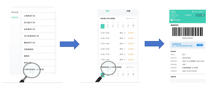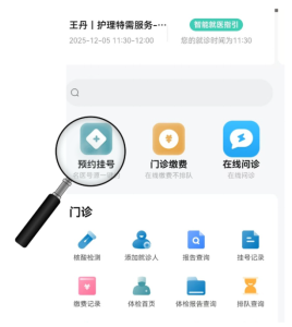 第三步:选择科室 “护理特需服务-上门护理”,并填写预约问卷完成预约挂号(预约挂号费用0元)。