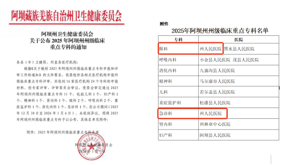 近日,阿坝藏族羌族自治州卫生健康委员会发布《关于公布2025年阿坝州州级临床重点专科的通知》,阿坝州人民医院急诊科、眼科凭借突出的综合救治能力、专业的诊疗水平和优质的医疗服务,成功获评2025年阿坝州州级临床重点专科。此次两个专科同时入选,是州卫健委对阿坝州人民医院急危重症救治体系和眼科专病诊疗能力的高度认可,标志着阿坝州人民医院学科建设再上新台阶。