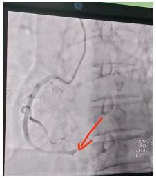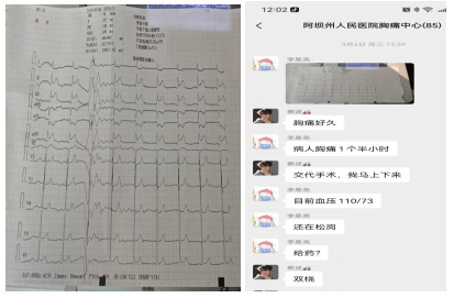 一名58岁的男性患者因“胸痛1+小时”患者遂电话联系急诊120,120出诊医师到达现场后根据病情立即完善心电图,提示“急性下壁心肌梗死”,立即电话和微信联系心内科导管室值班人员,明确急性下壁ST段抬高心肌梗死,马上给与“阿司匹林及替格瑞洛”抗血小板聚集,并在转运途中向患方告知病情(这是一种极其凶险的心血管急症,心肌坏死面积大,随时可能发生恶性心律失常、心源性休克甚至猝死),需要马上手术治疗,开通闭塞的罪犯血管,征得患方同意。于14:09到达阿坝州人民医院绕行急诊科及CCU,于14:12在医务人员陪同下到达导管室急诊行“冠状动脉造影术及冠脉内球囊成形及血栓抽吸及冠脉内溶栓术”,术后转入CCU进一步监护治疗。