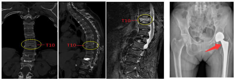 2020年03月11日,正值全国人民抗击新冠病毒肺炎迎来新希望之际,全国各大城市复工复产有序分批分次进行中。阿坝州人民医院骨科迎来一位特殊患者,该患者为72岁女性,4年前于外院行“腰1椎体骨折经皮椎体成形术”,2年前行“左侧全髋关节置换术”, 既往还有“胸8椎体陈旧性骨折”。此次因“摔倒致胸背部疼痛、活动受限26天”入院,诊断为“胸10椎体骨质疏松性骨折”。
