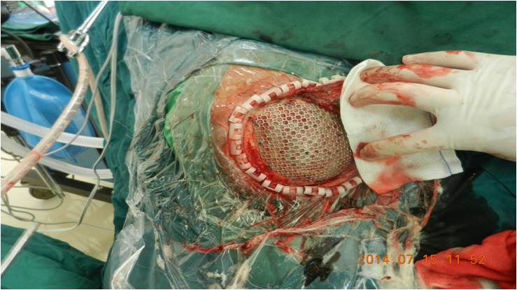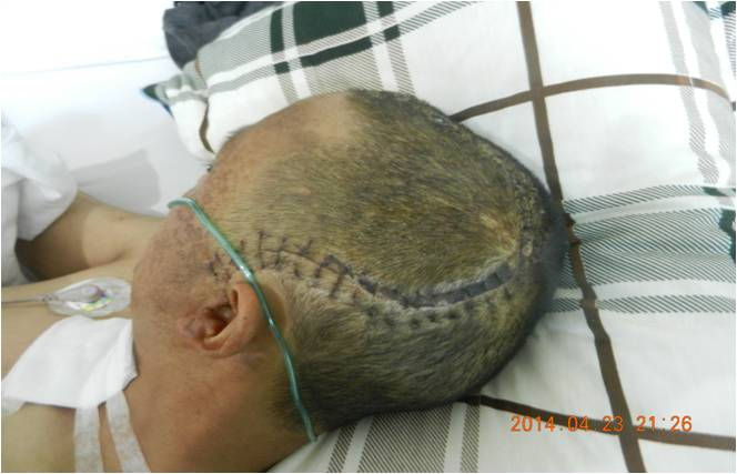 患者中年男性因"开放性颅脑损伤术后颅骨缺损1年"门诊入院。体格检查:头部右侧顶叶可见塌陷,颅骨缺损,可见脑组织搏动,入院后予完善术前检查,在全麻下行重建钛网颅骨修补术,术后患者生命体征平稳,患者头部伤口拆线,愈合II/甲,痊愈出院.
