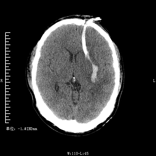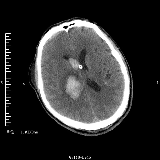 患者因"发现倒在地上伴呕吐2小时。"门诊入院于内科经内科入院后经于患者家属沟通后急诊全麻下行侧脑室穿刺引流术,术后转入重症监护治疗,术后患者意识由浅昏迷转为嗜睡状,患者经治疗后清醒出院。