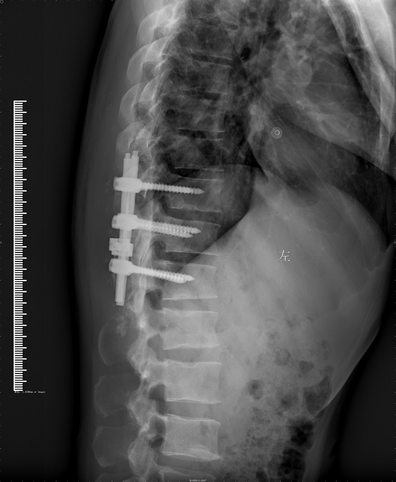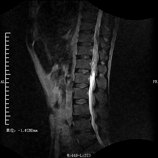 病史:患者中年男性;起病缓,病程长;以"腰背疼痛4年伴双下肢麻木无力进行性加重1年。"为主要表现,查体:查体:神清,腰背部:胸椎10-骶椎皮肤可见"艾交"瘢痕,椎体棘突广泛压痛,腹壁反射存在,腹股沟平面以下可见深浅感觉明显减退,以右侧为甚,疼痛刺激明显降低,肌力Ⅲ级,肌张力不高,病理征阴性,鞍区感觉降低,提睾反射存在;我院MRI示:1.腰椎退变;2.腰椎多个椎体许莫结节形成;3.胸10-腰1椎管内硬脊膜下见梭形片团状混杂稍长T1和稍长T2信号,脊髓向右推及变细,肿瘤性病变?其他?完善术前检查于全麻下经后路椎管内病变切除术+椎管降压术+后路内固定,术后予抗感染,止血,营养神经,请康复科康复训练,经治疗后患者现生命体征平稳,切口愈合I/甲,未见溢液及脑脊液漏,双下肢肌力左侧3-级,右侧肌力3+级,肌张力不高,感觉左侧下降至膝关节平面,右侧踝关节平面,术后3月复查患者扶拐行走。