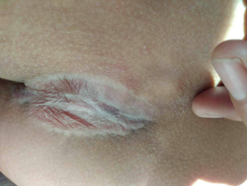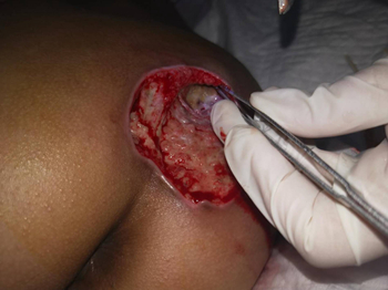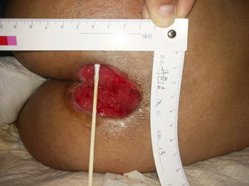 2018年1月5日21:09分阿坝州人民医院外一科收治一名13岁、脑瘫患者,骶尾部皮肤坏死流液12天,右大腿内侧皮肤破溃8天。