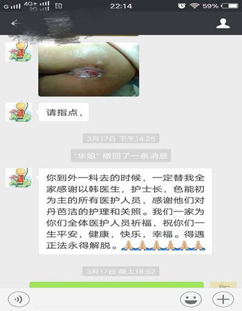 2月5日伤口造口小组再次对伤口评估:骶尾部4cmx4cm的创面、潜行12点---3点1cm、 窦道12点0.5cm、100%红色组织、伤口愈合情况好。病员于2月9日出院。出院后进行5次电话微信随访,指导其换药方法。伤口于3月底顺利痊愈。患者家属通过微信发来感谢信感谢帮助过她的所有医务人员。