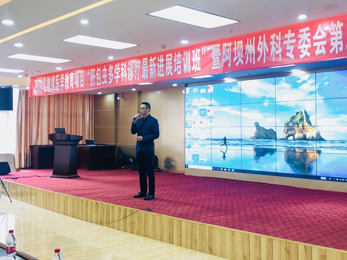 鉴于肝包虫病的复杂性和致病的多样性,肝包虫病的治疗需要个体化、多学科、综合治疗,已经逐渐成为共识,因此阿坝州人民医院于2018年10月27日-28日举办了省级继教项目“肝包虫病多学科诊疗最新进展培训班”,培训班邀请了包虫病临床治疗一线的专家教授介绍包虫病的多学科治疗进展,以提高阿坝州包虫病治疗的诊治水平。在杜刚副主任医师主持下,由阿坝州医学会外科专委会主任喻定刚教授致开幕辞,并代表医院对远道而来的四川省人民医院罗兰云教授莅临阿坝州人民医院指导工作表示热烈欢迎,同时热烈欢迎阿坝州的同道前来参加本次学术会议。喻教授言简意赅、深入浅出得说明了会议的重要性,并预祝大会取得圆满成功。罗兰云教授与阿坝州同仁合影留念后大会正式开始。