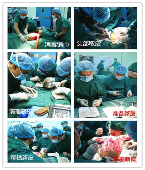 11月6日,主管医生文家智为患儿备血,备白蛋白,剃头等做好充分的术前准备,15:00患儿进入手术室,省医院麻醉科李佳岑麻醉师,我院麻醉科杨宇,欧志燕等麻醉师为患儿全麻,由省医院李巍主任主刀和黎明主任、文家智医生、罗俊毅医生,陈晨医生和向庆勇医生共同为患儿完成:头面颈躯干四肢烧伤清创切痂取自体头皮左大腿网状游离皮移植术。为减轻患儿痛苦并根据患儿现病情允许的情况下,省医院李巍主任和州医院黎明主任决定尽量一次性烧伤创面全植皮以减轻患儿痛苦。手术室护士长哈姆老师也全程参加了手术,极力配合手术医生。手术在全体医护人员的共同努力下历时5个多小时,成功完成头面颈部躯干四肢皮肤移植,手术圆满成功。