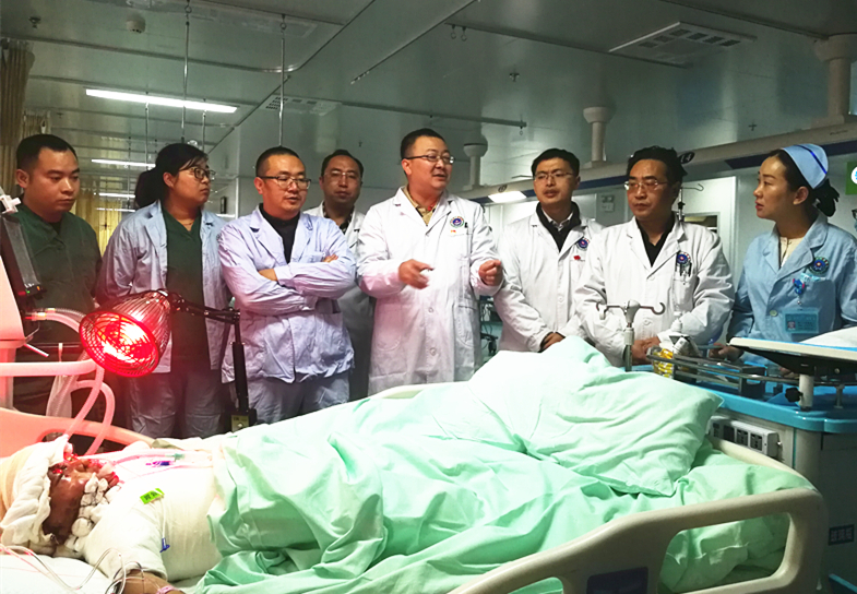 11月7日09:00省医院李巍主任和州医院黎明科主任带领全体医护人员一同查看患儿病情,为我院对患儿后续治疗作出建议及指导。在我院烧伤科全体医护人员的关心及治疗后,患儿烫伤创面逐渐缓解,为了帮助患儿早日出院,我院烧伤科主任黎明副主任医师带领科室人员积极向四川省人民医院及烧伤专业教授请教指导,目前患儿创伤面积已明显减小,坚强的小朋友为着早日在明媚的阳光下玩耍仍受着病痛的困扰坚持着,我院烧伤科医护人员为了实现患儿的愿望继续奋斗,希望他早日康复。