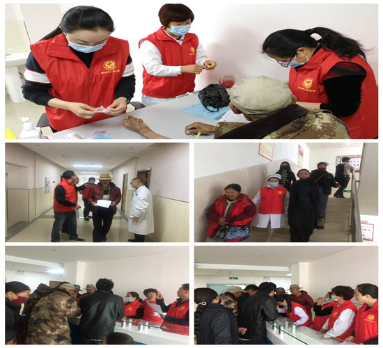 5月10日由行后支部和外科支部组成的志愿者服务队,分为5小组带领贫困群众进行体检。对腿脚不便的老人,志愿者搀扶着他们从电梯上下;对言语不通的群众,志愿者请来“通司”进行翻译;对参与妇科检查的妇女,志愿者注重保护其隐私;对需要特殊检查的群众,志愿者为他们倒去一杯杯热水。大家井然有序、忙而不乱,一项接一项的完成了体检。