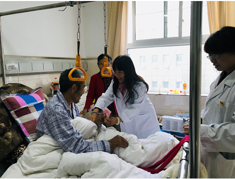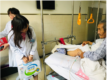 刘志红副院长一行来到夺里滚所住病房后,详细了解了他的病情、查看了他的伤口,并对目前夺里滚一家的居住条件、收入情况、外孙子就学等情况进行询问。最后,刘志红副院长为夺里滚及其老伴儿送上慰问品及慰问金,并叮嘱他们,要加强营养,注意身体,心态要放松,安心养病,有任何需求都可以提出,医院将尽力帮助解决,并祝愿他们国庆快乐。